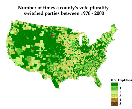 So while the trends of Native Americans on reservations and unionized miners typically voting for Democrats are put into stark relief by the overwhelming majority of the West voting Republican, a perhaps more interesting trend is the confusion of results in the middle of America. It is fascinating to contemplate the reasons behind the hodgepodge of results up the Mississippi River valley and across the south. We can think of no good explanations except to mention the size of the counties (much smaller than in the West) offering more data points, increased population density in these areas with lots of water and fertile soil, and the mix of farming, cities, transportation and industrial jobs that are not in such close proximity across the West. It appears as if these parts of the country cannot make up their mind which party to support, a fact of great interest to candidates for President.