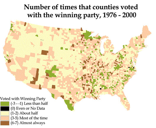 Regardless of the candidate's party, those counties that vote with the winner will be of great interest. This map shows the number of times each county has voted with the winning party over the past seven elections. While the past is certainly no perfect predictor of the future, it's one of the few tools we have to work with. By looking up the counties that always vote with the winning party (and there are many) this map can provide guidance on both where to find the voters who have been most in tune with political winds, and what the proper demographic mix may be when trying to find a representative set of voters to poll. It can be used the other way, too. It may also be valuable to know the demographic mix and beliefs of the counties least likely to vote with the winner so as to avoid appealing to those voters!