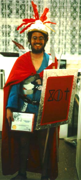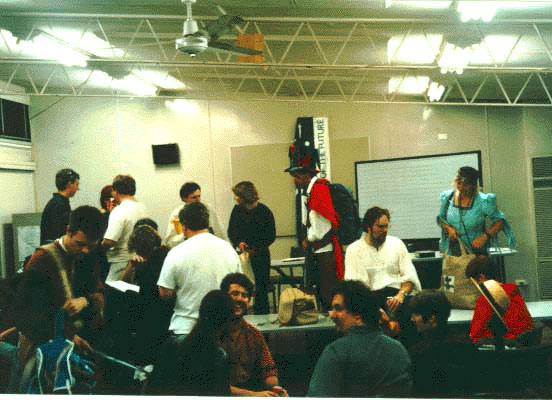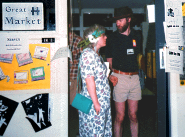 Malana Goodnight and Toleander Planter confer in Boldhome's Great Market, surrounded by campaign posters. (photo by Pam Carlson)