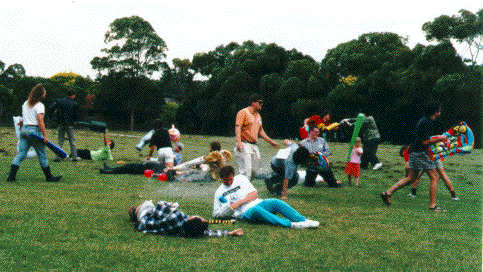 A scene from the Live Action Trollball game at RQ Con Down Under, Jan 1996. Michael O'Brien is the Giant Referee. Spectators were encouraged to throw water balloons. (photo by Elise Bowditch)